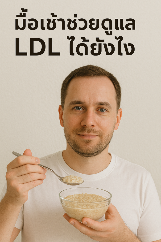 มื้อเช้าที่ดีควรมี ไฟเบอร์สูง + ไขมันดี + โปรตีนพอเหมาะ เพื่อช่วยดักจับ LDL ตั้งแต่เริ่มวัน และป้องกันการกินเกินในมื้อต่อไป